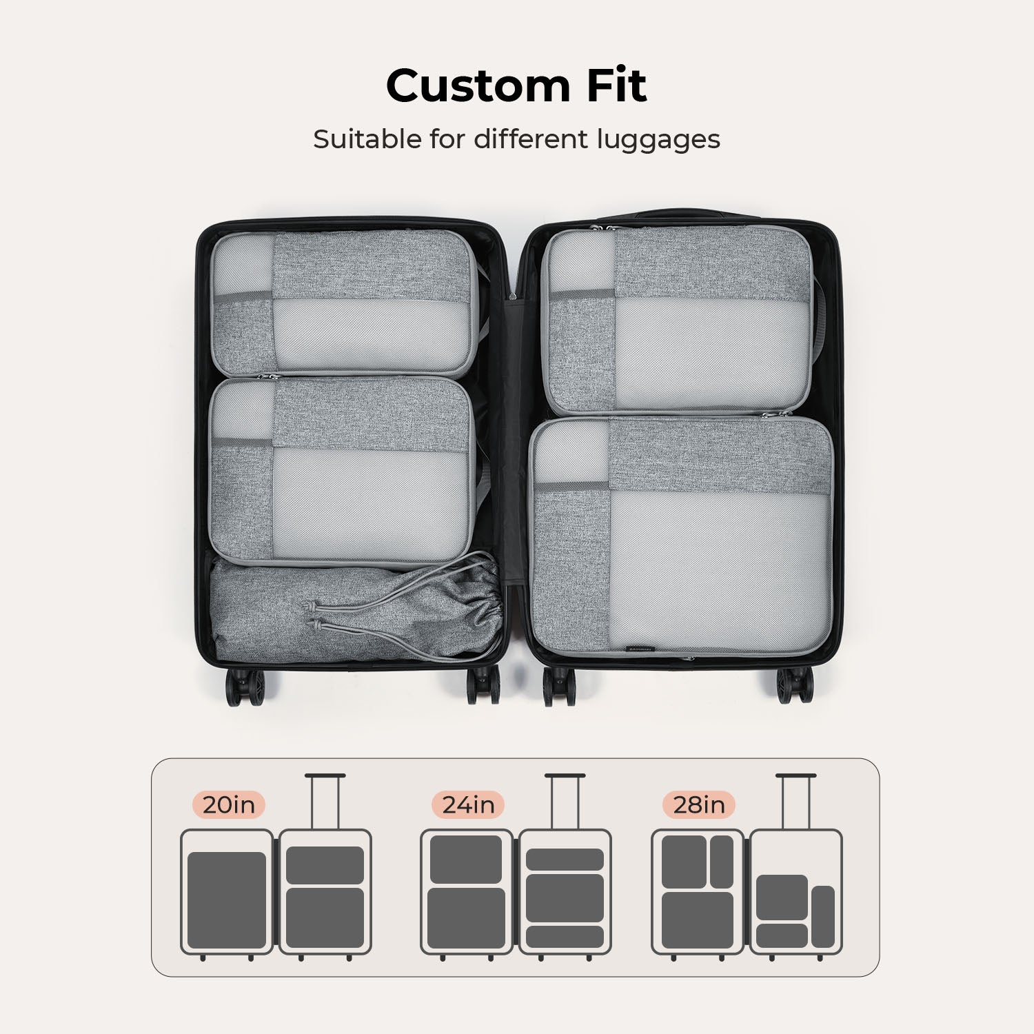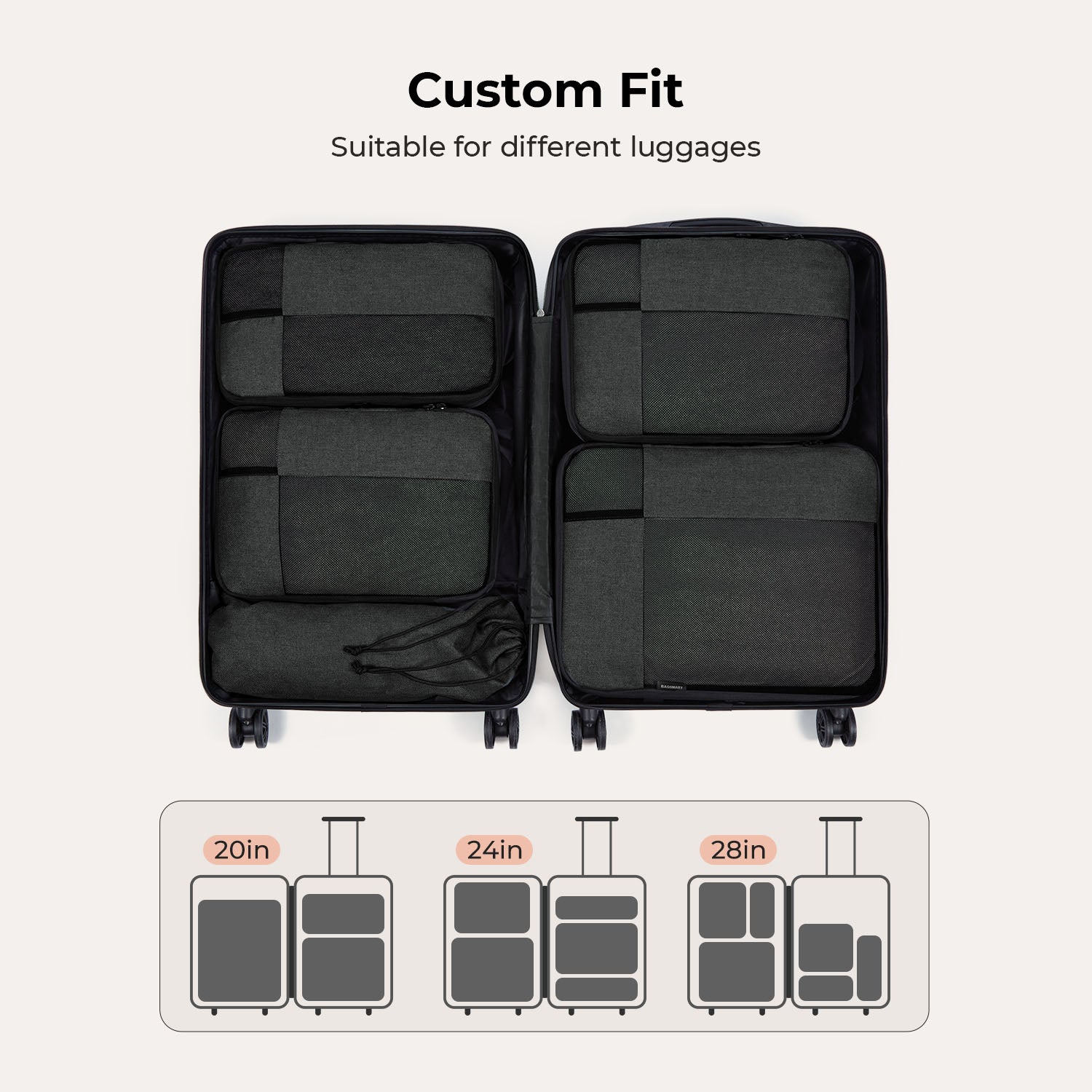 Introducing our new Compression Packing Cubes! These lightweight cubes are designed to hold all your travel essentials without taking up too much space. The packing cubes features different sizes to help store and divide different items; this set also comes with a bonus shoe bag. These cubes also feature compression technology which helps to minimize bulk so you can fit more items in your suitcase. So forget about having to search through messy suitcases trying to find what you need: simply open up 6PCS Compression Travel Packing Cubes for Suitcases and get ready for your trip the smart way.