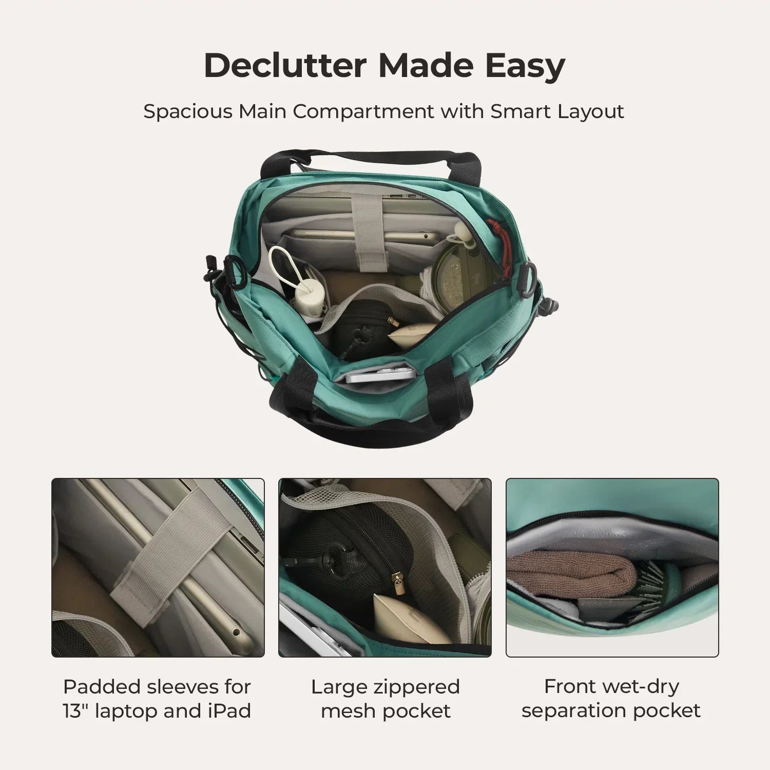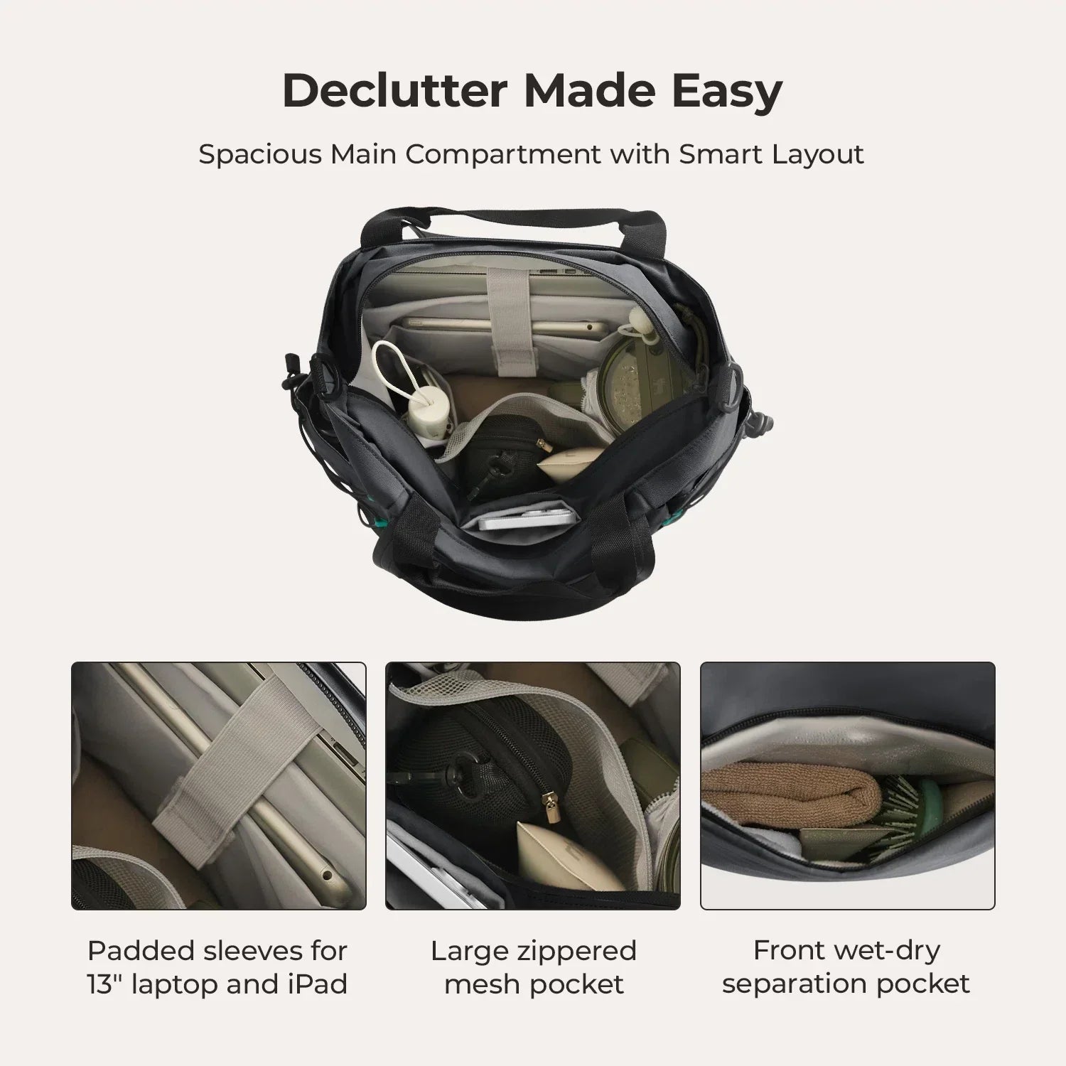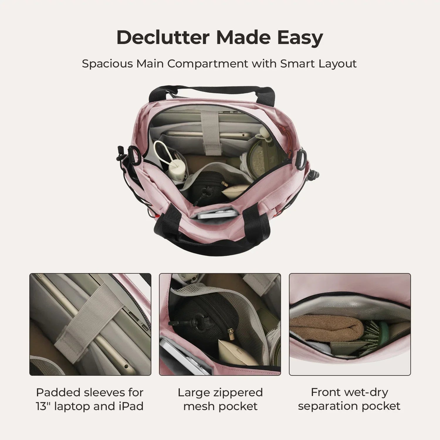 This tote understood the assignment, easily carrying you through workouts, workdays, and weekend plans. We designed it to go from lift to laptop, balancing structure with stretch—featuring a detachable mesh pouch, dual water bottle pockets (inside and out), and a laptop sleeve that doesn’t play. From locker rooms to lecture halls, this bag never breaks a sweat. And yes—it fits a Stanley.
