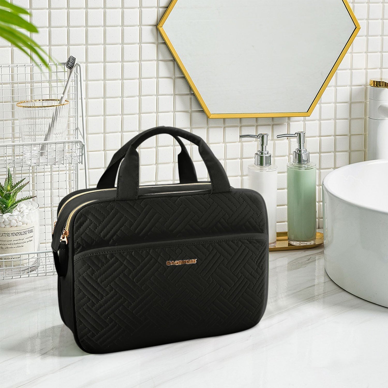 The Travel Water-resistant Makeup Organizer Bag captures Bagsmart's vision of elegance and versatility. The multi-functional toiletry bag can hold full-sized toiletries, cosmetics, hygiene products, etc. Featuring double side full open design to keep cosmetic bottles standing upright in the middle compartment, this bag for travel can hold all your travel necessities well-organized.